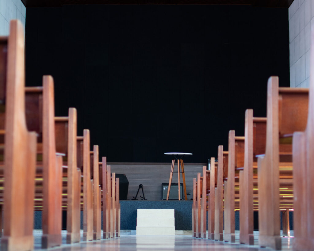 Caso queira uma porta em madeira ou aço, deve atentar que será perdida a visão interna da igreja, mas a funcionalidade das portas acústicas são excelentes. Apesar de serem mais caras, as portas em vidro multilaminado são mais eficientes e bonitas.