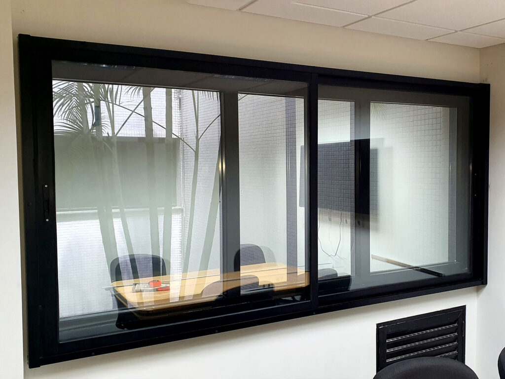 Quanto as portas, para evitar a quebra para retirar os batentes e efetuar a troca, aproveitamos os batentes instalados e colocamos contra batentes com borrachas para isolamento e trocamos a folha por uma acústica, com isolamento de 25, 30 ou 38 dB. Cabe ressaltar que todas as portas acústicas da Acústica em Foco possuem guilhotina na parte inferior da folha.